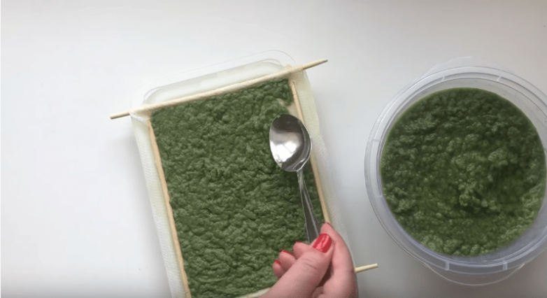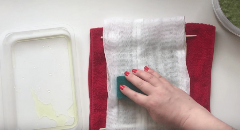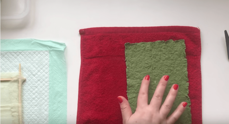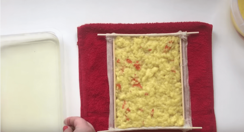Перекладываем рамку на полотенце и накрываем получившийся в рамке лист несколькими слоями марли и, слегка прижимая ее к поверхности, промакиваем массу губкой или тканью, чтобы убрать лишнюю влагу.