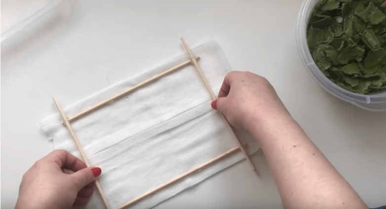 Для создания бумаги нам потребуется специальная рамка, которую можно как купить, так и сделать самостоятельно. Для этого просто растягиваем материал (марлю в 4 слоя или фатин) на готовой фоторамке или самодельной рамке, сделанной, например, из деревянных палочек. Зафиксировать все можно с помощью горячего клея.