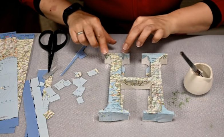 Смажьте каждую букву клеем ПВА, сверху наложите лист из дорожного атласа, удалите излишки и заверните края, чтобы заготовка выглядела аккуратно.