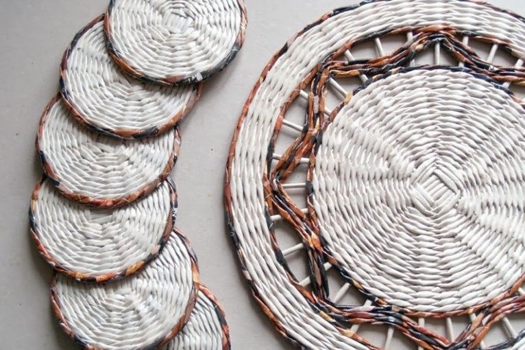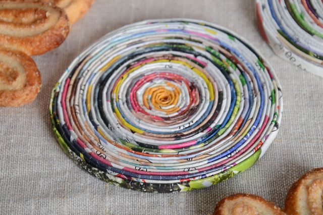 Чтобы изготовить такую подставку понадобятся только старые газеты, спица и клей ПВА. На спице нужно скрутить из газетных листов трубочки. Начинать плетение можно различными способами. Например, можно разложить в вертикальный ряд 20 трубочек, которые будут поочередно оплетаться горизонтальными трубочками. Можно плести по кругу, накручивая трубочки от центра по спирали.