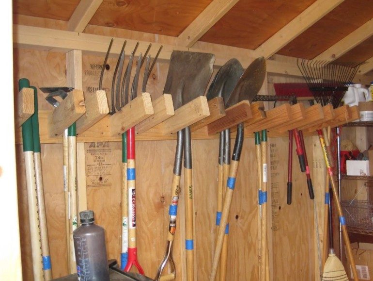 Под ней идеально, разместить, мелкий садовый инвентарь: ножницы для резки травы и кустарников, ножовку по дереву, молоток и другой необходимый инструмент. Их будет удобно доставать, когда они понадобятся. Остальные предметы закрепить между брусками, чтобы потом легко воспользоваться.