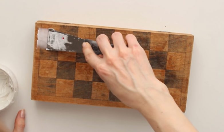 Очистите доску от пыли. Чтобы заполнить все трещины и царапины, нанесите на доску тонкий слой шпаклевки по дереву.