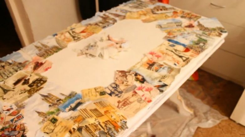 После завершения работ с ножками перейдём к столешнице. Её мастерица украсила в технике декупаж. Для этого подготовьте салфетки: вырвите рисунки, разделите салфетки на слои, оставив только один тонкий слой с рисунком. Примерно разложите на столе, как это будет выглядеть в итоге.