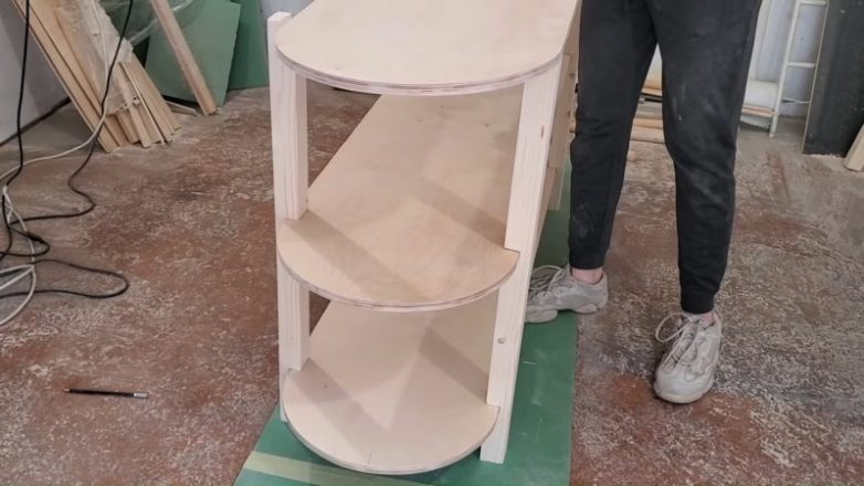 Из фанеры 1,5*1,5 м следует выпилить три равные стенки с закруглёнными углами.