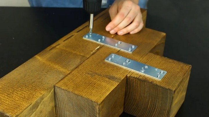 Теперь переворачиваем конструкцию металлическими пластинами вниз и, отцентровав, ставим на самую длинную часть элемент средней длины. Скрепляем их вместе описанным выше способом.