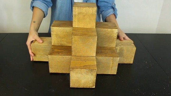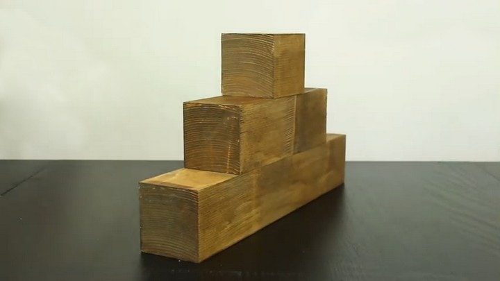 Для проекта вам понадобятся отрезки толстого деревянного бруса. Примерные размеры: самый длинный элемент — 44, 5 см (1 шт.), средний элемент — 26, 5 см (2 шт.) и самый короткий — 9 см (3 шт.)