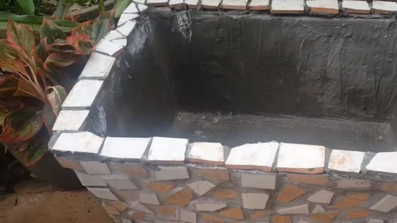 «Бортики» также выложены плиткой. Получилась основа! Это может быть как большой вазон для цветов, так и аквариум, и пруд, по вашему желанию.