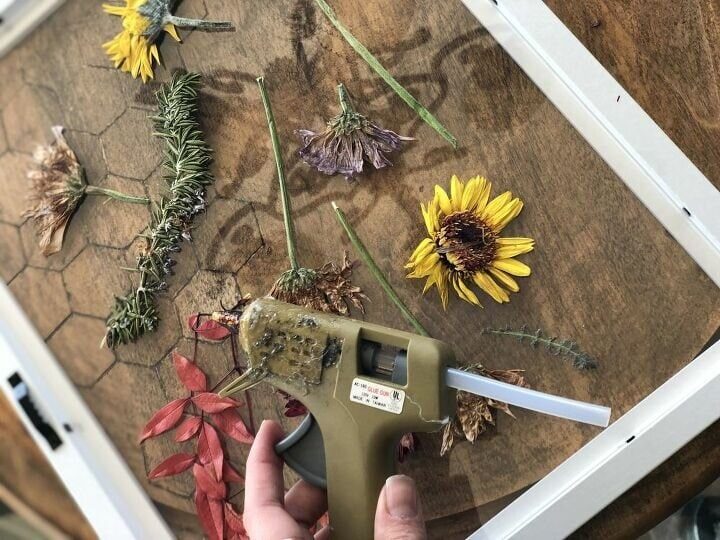 Теперь возьмите обычную фоторамку и расположите на стекле цветы, создавая желаемую композицию. Каждый цветок можно зафиксировать маленькой капелькой клея.