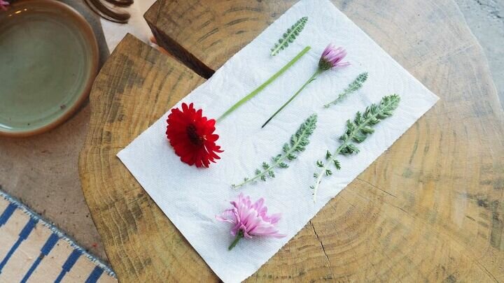 Отправляйтесь на прогулку и соберите букетик цветов, которые хотелось бы сохранить. Выложите их на бумажное полотенце так, чтобы они не касались друг друга. Цветки с массивными головками сразу расположите так, чтобы соцветие было полностью развёрнуто вверх или вниз.