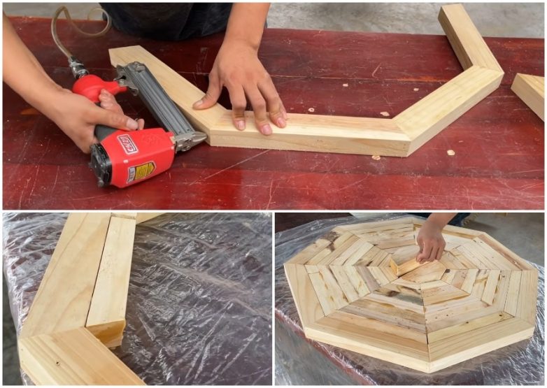 Столешница сделана из клееного бруса, она буквально собрана по принципу мозаики. Очень важным моментом является то, чтобы древесина была сухой. Иначе со временем ее может повести и столешница потеряет свою привлекательность. Деревянный щит представляет собой правильный восьмигранник. При нарезке доски выдерживать пришлось не только толщину. Важным параметром здесь является угол спила, составляющий 67,5 градуса. Именно под этим углом должны быть обрезаны все до единого бруски для столешницы. Каждый ряд состоит из 8 деталей. Длина заготовок с каждым рядом уменьшается. Длинная сторона каждого следующего ряда соответствует короткой предыдущего. В центр вставлен восьмигранник, состоящий из двух частей.