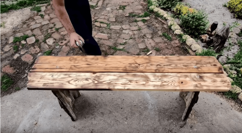 Готовую скамью по желанию можно обжечь горелкой, покрасить краской или покрыть лаком. Не лишним будет также обработать ее специальной пропиткой, которая защитит дерево в том числе и от паразитов.