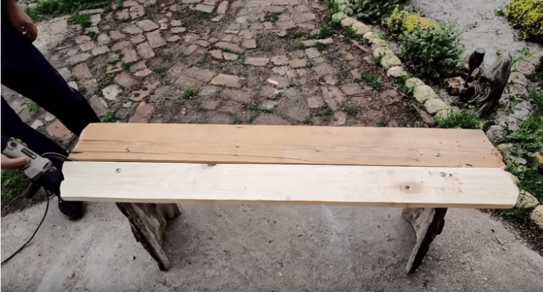 Для сиденья потребуется деревянная доска подходящего размера. Доску обрезаем и прикручиваем к уже готовой опоре подходящим креплением. Кстати края можно сделать фактурными, напоминающими по форме кору дерева.