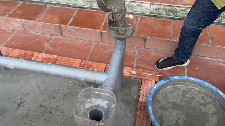 Собранную конструкцию из пластиковых труб вставляем в цементно-песчаный раствор, которым мы заливали столешницу.