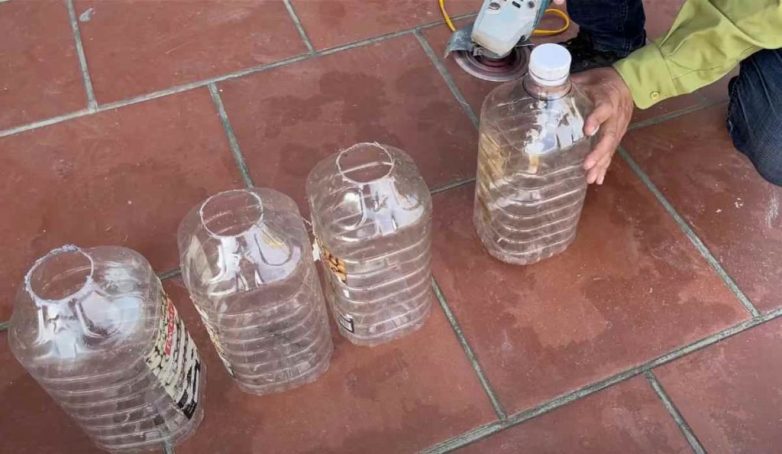 Дополнительно нам потребуются четыре пластиковых баклажки: отрезаем у них горловину, а потом отрезаем по размеру — это будут формы для заливки «опорных подошв».