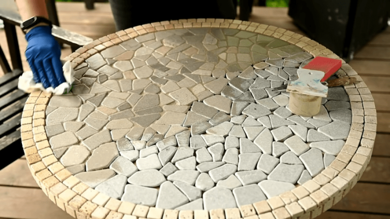 Принцип работы здесь сходный: в начале собирается рисунок, а затем каждый фрагмент садится на клей. Следующий этап — нанесение затирки. В этом проекте использована эпоксидная затирка, благодаря которой мозаика приобрела эффект мокрого камня, а столик для улицы улучшил износостойкость и стал выглядеть более привлекательно.