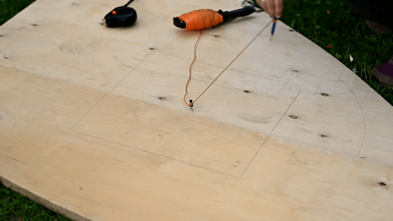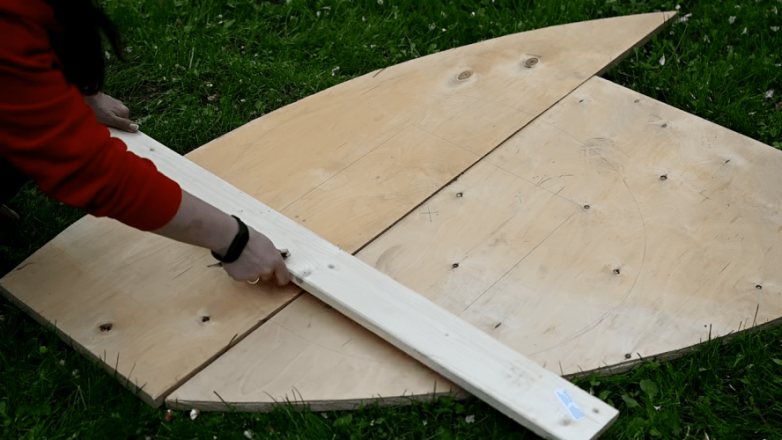 Основой для столешницы стали остатки фанеры. Обратите внимание, в проекте использованы 2 листа. Состыковав листы лицом вниз, прикладываем к основе перевернутую табуретку. Находим центр и вбиваем в него обычный гвоздь. Берем кусок веревки, с одного конца привязываем карандаш, а на другом делаем петлю и накидываем на головку гвоздя. Получаем примитивное приспособление, способное заменить циркуль, при помощи которого размечаем параметры столешницы.
