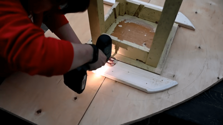 Наносим на доски разметку. Установив посредине табуретку в качестве ориентира, присверливаем доски к поверхности. В идеале выбираем такие шурупы, которые не проткнут фанеру насквозь, чтобы не пришлось после спиливать выступающие части.