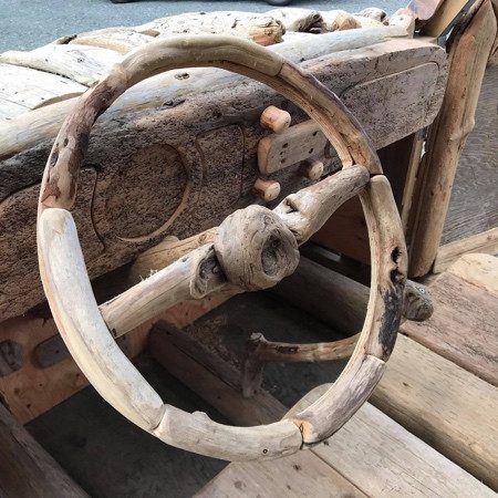 Деревянный VW «Жук» оснащён каркасом, сиденьями, колёсами, дверьми и функциональным рулевым колесом, и всё это — из коряг.
