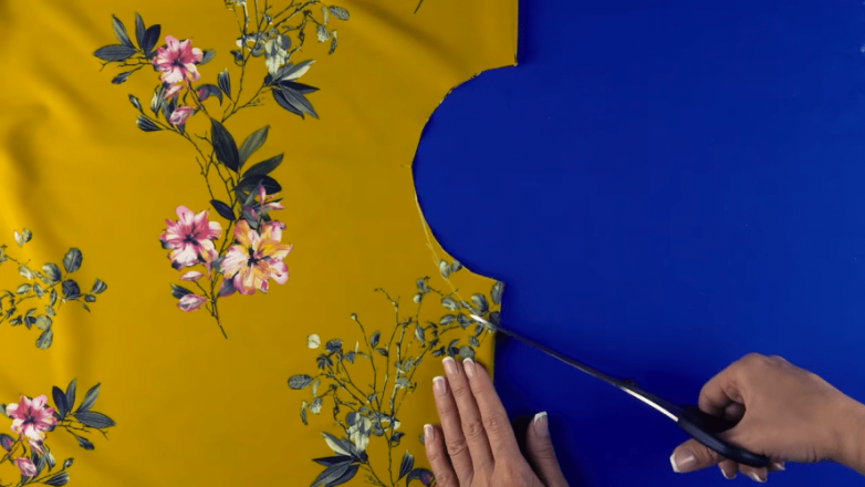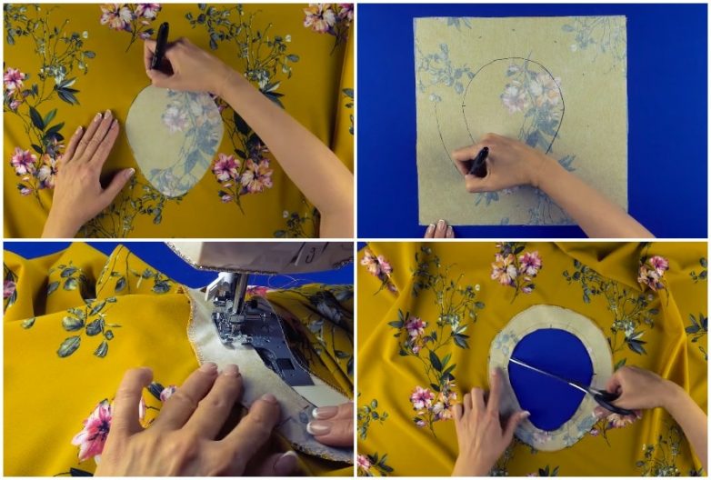 Берем маленький квадрат, совмещаем с флизелином и хорошо разглаживаем. Подкладываем ткань с флизелином под горловину и обводим контур. Со всех сторон по периметру делаем отступ в 4 см, а затем вырезаем получившуюся деталь. Она понадобится для обтачки горловины. Обрабатываем внешний край обтачки, затем прикладываем ее к горловине по принципу лицо к лицу и прокладываем строчку с отступом в 0,7 см. Делаем насечки по кругу, не доходя до шва, затем подгибаем обтачку так, чтобы она полностью оказалась внутри и снова прокладываем строчку.