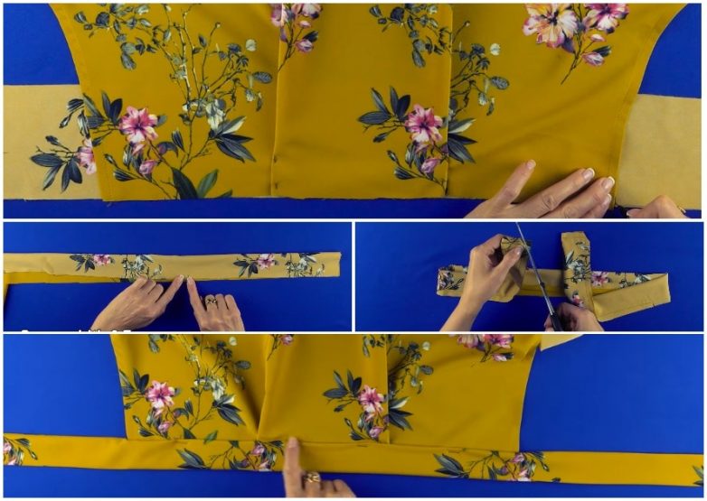 Прикладываем к сформированному низу одну из полос так, чтобы выступающие по бокам части были равными и делаем пометки на будущем поясе.