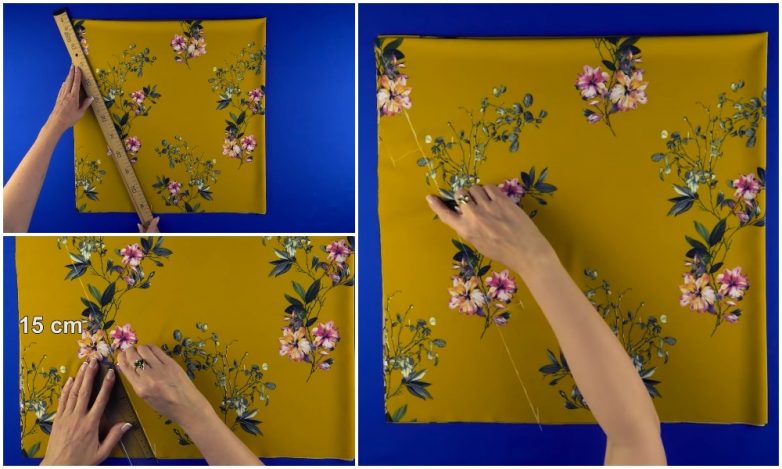 В верхнем внутреннем углу размечаем горловину. Для этого откладываем в стороны от угла по 7 см и делаем такую же разметку в промежутках между точками. Дальше остается лишь вырезать ткань с одной стороны по полученной линии изгиба, а с другой по горловине.