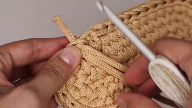 После глажки нужно сделать ряд вокруг всего полотна соединительными петлями рабочим шнуром — это укрепит донышко. Теперь стенки сумки вяжутся популярным узором паркет. Как только был провязан ряд, на повороте нужно соединить конец и начало ряда хвостиком, тем самым ввязывая его постепенно в вязание. Делать это нужно именно на повороте, так, чтобы на готовом изделии этого почти не было видно, так как это будет боковая стенка сумки.