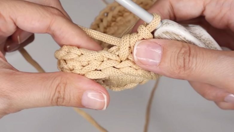 Далее вывязывается, расширяется и укрепляется дно. Ряды вяжутся по кругу уже одним крючком, как обычно. Делается петля подъема, столбик без накида (1 точка поворота). Затем вяжутся по ряду обычные петли без накида. Когда доходите до второго поворота, в точку поворота ввяжите 3 столбика. Далее, снова вяжем обычные петли без накида, доходя до следующего поворота.
