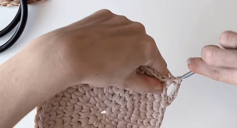 Обвязав обе ручки, переходим к сборке. Здесь важно, чтобы клубок с рабочей нитью не был чрезмерно велик, так как его по мере работы нужно будет пропускать через кольцо.
