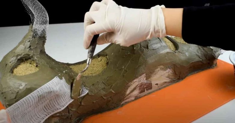 Далее можно приступать к декоративному оформлению поверхности кашпо — создаем имитацию коры дерева с помощью специальной «лопатки» для художественной работы с раствором, скальпеля, ножа или любого другого подручного инструмента.