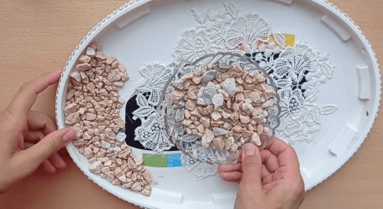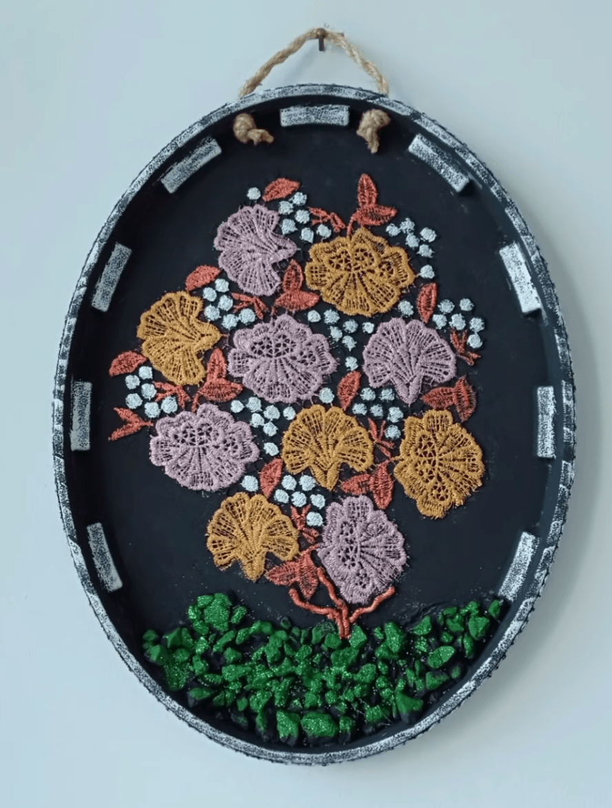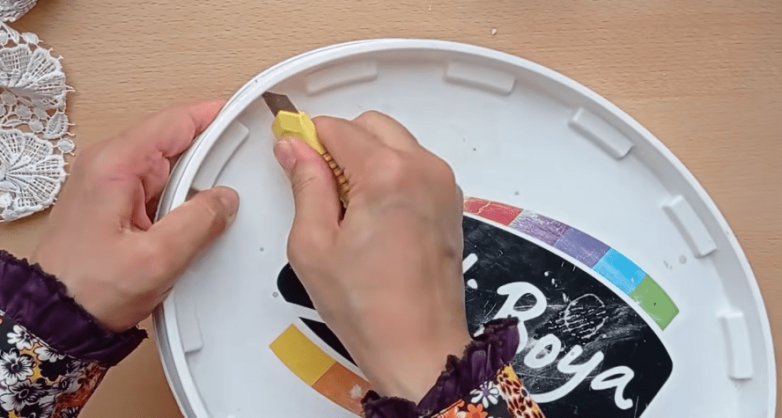 крышка от пластикового ведра подходящего размераостатки гипюровой ткани или резиновая салфетка с цветочным орнаментом