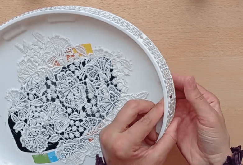 Примеряем кружево, вырезаем нужный фрагмент, а затем наклеиваем его прямо на крышку. Оклеиваем крышку по торцу кружевной лентой, при необходимости на срезах припаливаем концы. Оставляем свободными отверстия для крепления.