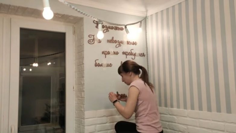 Декор должен быть в меру, но всё же должен присутствовать. На стену справа возле балконной двери мастерица приклеила небольшую мотивирующую фразу.