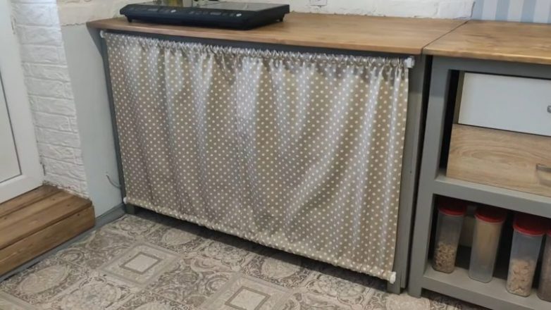 Поскольку дверцы не были сделаны (дорого по смете из-за высокой стоимости фанеры), то хозяйка просто пошила шторы. Сюда были спрятаны многочисленные кастрюли/сковородки, а также техника, которой пользуются не каждый день (наподобие мясорубки).