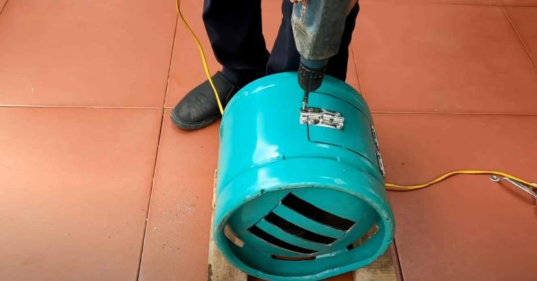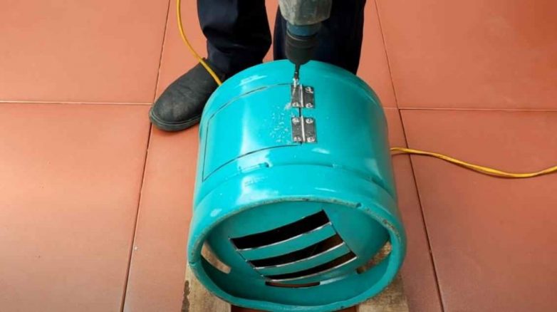 В дне баллона вырезаются отверстия колосника, а в стенке — дверца. Прикручиваем дверцу на петли.