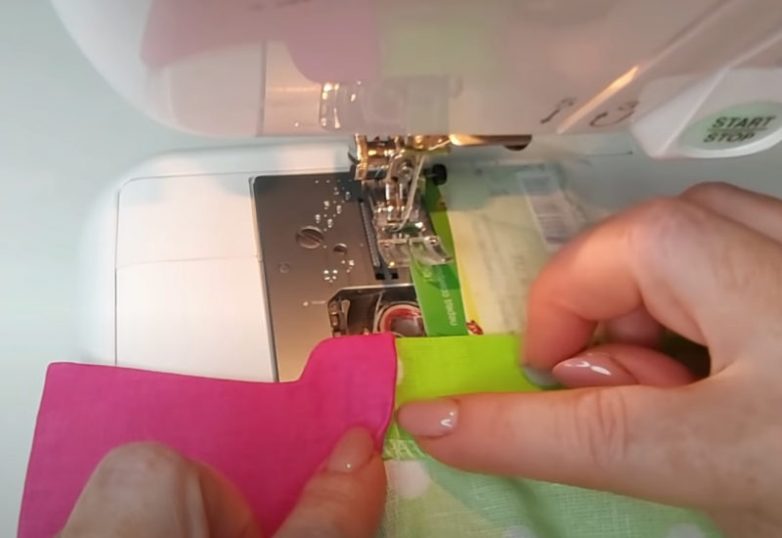 Дойдя до второго плечевого шва снова увеличьте подгиб и закончите работу. Благодаря использованию пластиковой карты получается аккуратный ровный шов, который отступает от края ровно на 0,1 см.