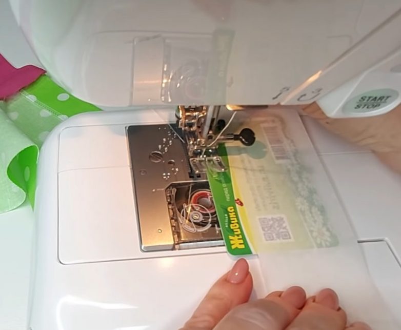 Опустите иглу швейной машины и расположите пластиковую карту так, чтобы она находилась на расстоянии 0,1 мм от иглы. Закрепите карту в этом положении с помощью малярного скотча.