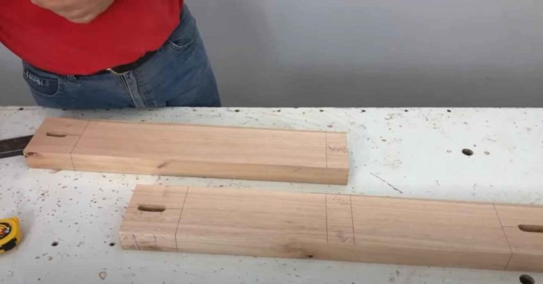 На следующем этапе отпиливаем еще две доски. Вырезаем в них пазы и шипы, после чего собираем соединительную Т-образную перекладину.