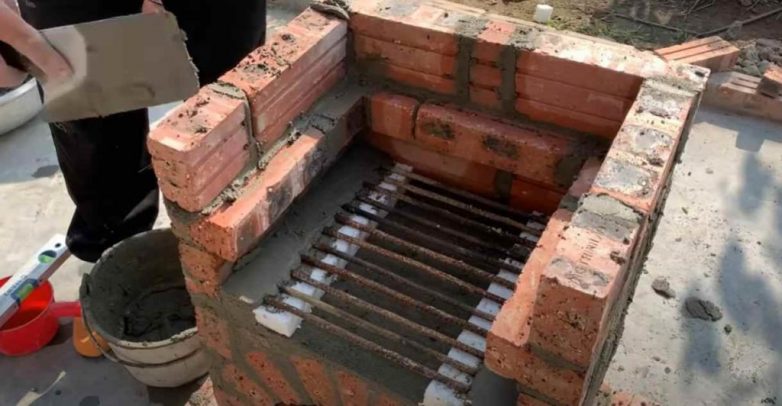 Чуть выше колосника из кирпича необходимо будет сделать дополнительные бортики, на которые будет укладываться металлическая решетка для мяса. Верхняя часть печки остается открытой.