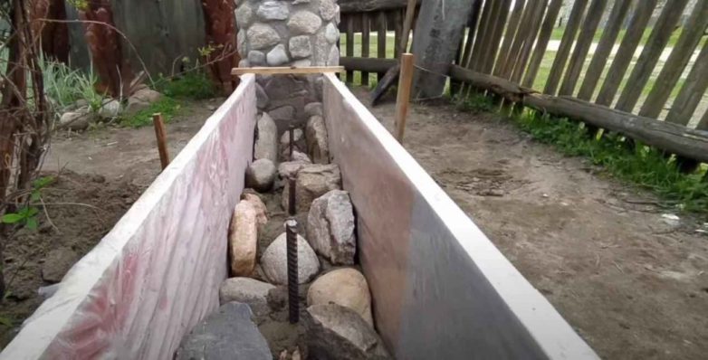 Между столбами устанавливается деревянная опалубка, которая заполняется раствором и камнями.