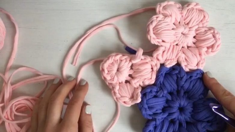 Третий цветок, например, уже будет соединён не двумя лепестками, а тремя, и т. д. По ходу вязания нового цветка, присоединяйте лепестки к основному вязанию, и у вас получится безотрывное вязание цветочной поляны!