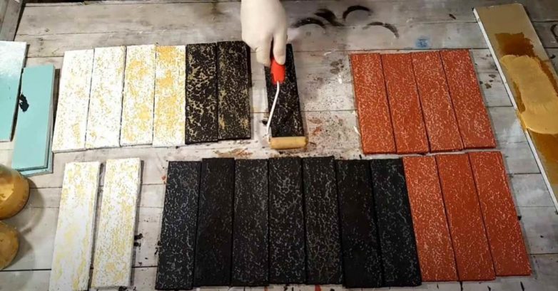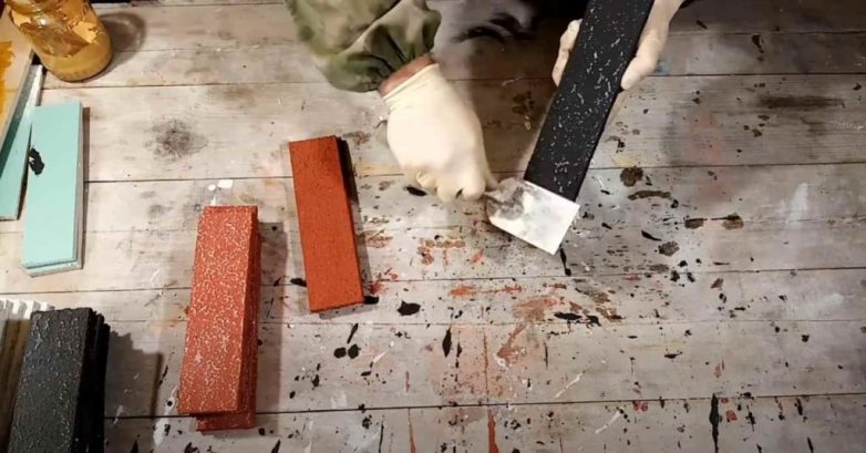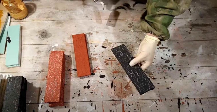 Добавляем его в структурную краску, и перемешиваем. При помощи кисточки наносим краску на поверхность декоративных кирпичиков. С помощью губки придаем фактуру.
