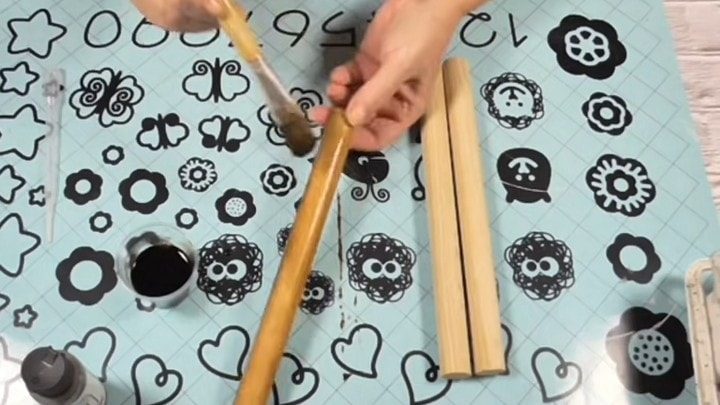 В качестве ножек для полочки можно использовать черенок от швабры, метлы или лопаты. Его необходимо распилить на три одинаковых по длине отрезка. При желании ножки можно тонировать с помощью морилки для дерева.