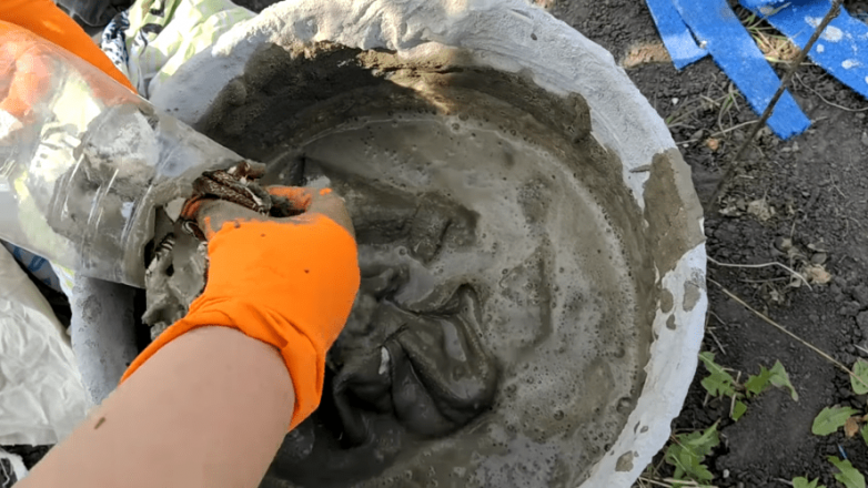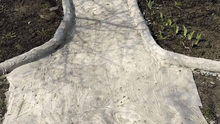 Старые ковровые дорожки или куски ковролина при необходимости обрезаем до нужного размера. Смачиваем коврики в таком же растворе. Стоит учесть, что пропитавшиеся цементом большие куски существенно прибавят в весе и работать с ними в одиночку будет тяжелее.