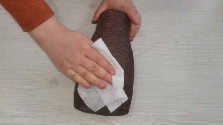 У бутылки отрежьте горлышко, снимите этикетку. Всю поверхность оберните верёвкой, прикрепляя её горячим клеем. К верхней части и дну приклейте картон