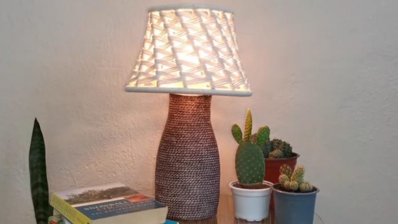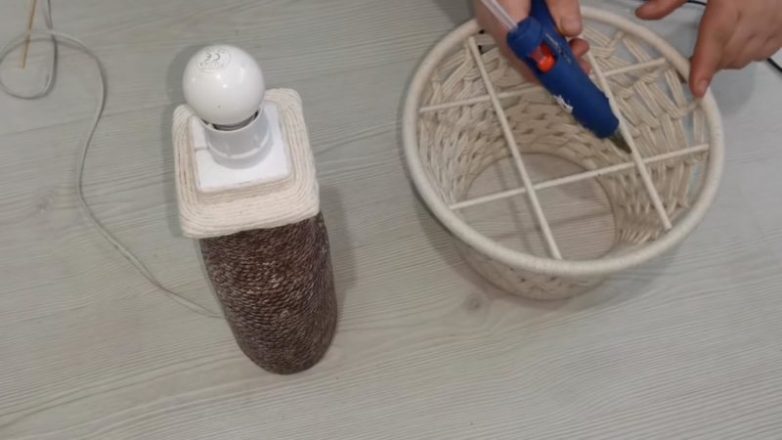 К верхней части приклейте картон или другой материал, оберните джутом/пряжей в тон. Закрепите лампочку.