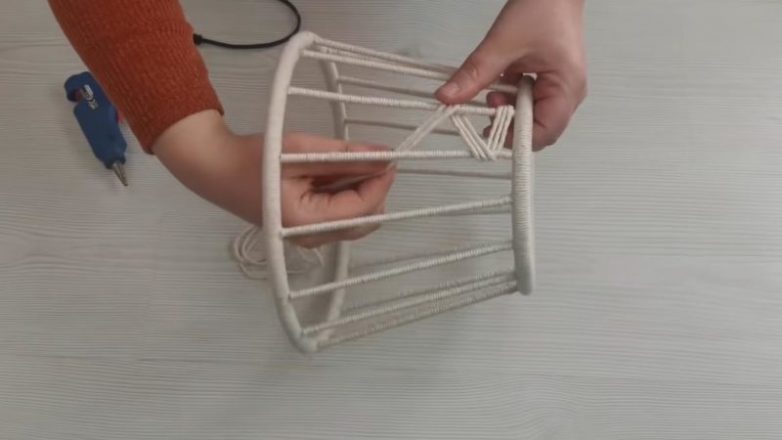 Держа одновременно три отреза верёвки/пряжи, приклейте их сверху и начните оборачивать, как на фото, чтобы получить красивый узор. Сделайте так со всех сторон.