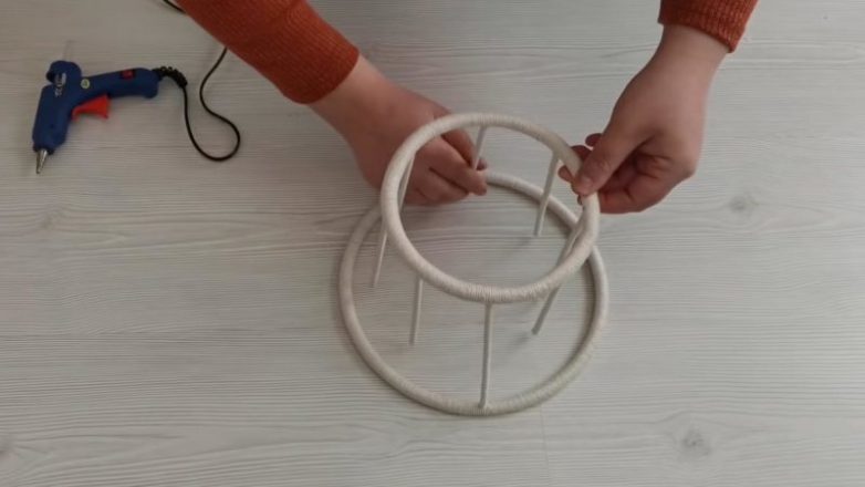 Проволоку согните в несколько раз и оберните малярным скотчем. Оберните в кабель, который также оберните джутом или пряжей. Сделайте два таких круга — большего и меньшего диаметра.