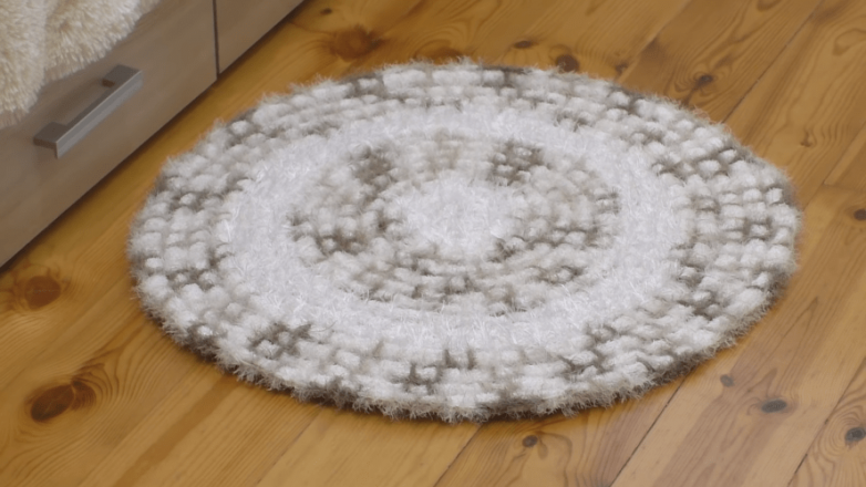 Для сборки используем остатки синтетической нити с ворсом. Именно за счет этого коврик будет казаться особо пушистым. Понадобится для работы и подходящий крючок. По сути сборка представляет собой обвязку по спирали.