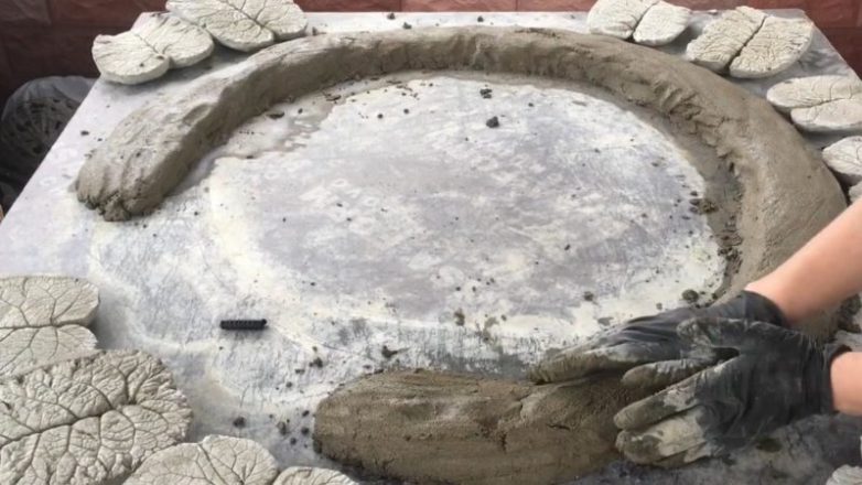 Разметьте, какого диаметра хотите сделать бордюр для клумбы, выложите примерно лопухи из цемента.