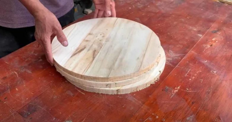 На склеенных деревянных щитах (или листах фанеры) чертим окружность, потом вырезаем на ленточной пиле или с помощью электролобзика.